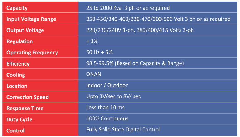 In our Buck/Boost transformer we are using CRGO laminations to minimize iron losses and coils of Buck/Boost Transformer are wound with heavy section of m strips electrolytic copper to minimize copper losses for getting better efficiency of the equipment. The coils of Voltage regulator are vacuum impregnated and oven dried as per requirement.